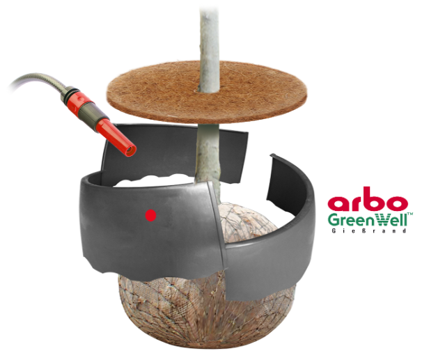 Zavlažovacia misa ku stromom sa dodáva spolu s kokosovou podložkou pre lepšie udržanie vlahy a poskytuje ochranu kmeňa pri kosení trávnika. Odolnejšie riešenie oproti zavlažovaciemu okraju zo zeminy.